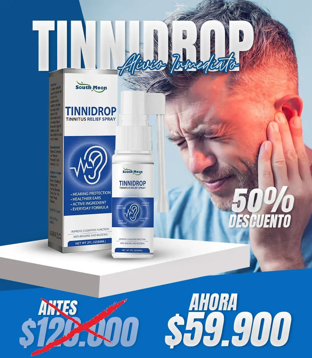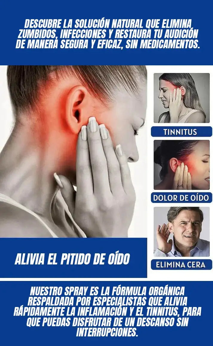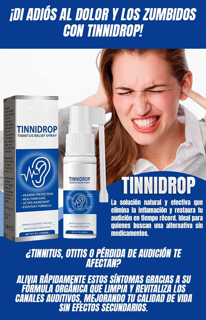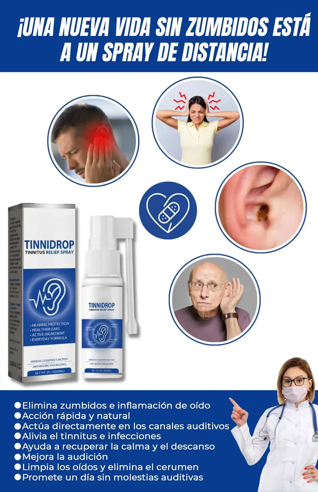 El TinniDrop Spray es un remedio natural en forma de spray diseñado para aliviar el tinnitus (zumbido en los oídos), otitis (infecciones del oído), y mejorar la audición. Además, limpia los canales auditivos, reduce la inflamación y alivia otros problemas auditivos como la pérdida de audición y la acumulación de cerumen.